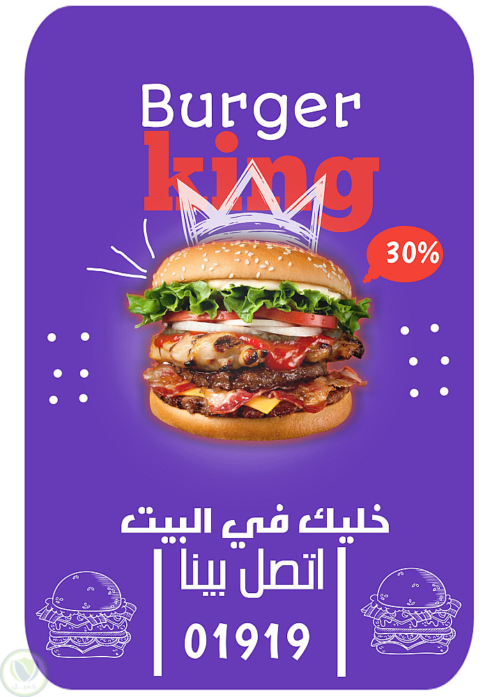 عناصر التصميم: صورة برجر - تاج على البرجرـ خصم 30%-بعض الإضافات المرسومة - عبارة burger king - رقم تلفون + عبارة إتصل بينا- اثنين برجر مرسومين في الزوايا السفلية من التصميم.