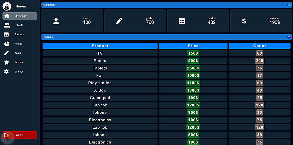 لوحة تحكم متجاوبة تمامًا تم تصميمها باستخدام HTML وCSS، توفر تجربة مستخدم سلسة عبر أجهزة الكمبيوتر المكتبية والأجهزة اللوحية والهواتف المحمولة. تتضمن اللوحة رسومات متحركة تضيف طابعًا ديناميكيًا وتعزز التفاعل مع الواجهة. يعتمد التصميم على مبادئ التكيف مع مختلف الشاشات باستخدام تقنيات متقدمة من HTML وCSS، مع التركيز على تحسين الأداء لضمان تجربة استخدام مريحة وفعّالة.