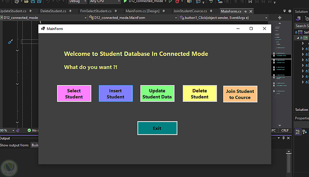 مشروع "نظام إدارة الطلاب باستخدام ADO.NET" هو تطبيق مكتبي بسيط تم تطويره باستخدام تقنية ADO.NET Connected Mode، يهدف إلى تسهيل إدارة بيانات الطلاب من خلال عمليات CRUD (إنشاء، قراءة، تحديث، حذف) على جدول الطلاب في قاعدة البيانات.