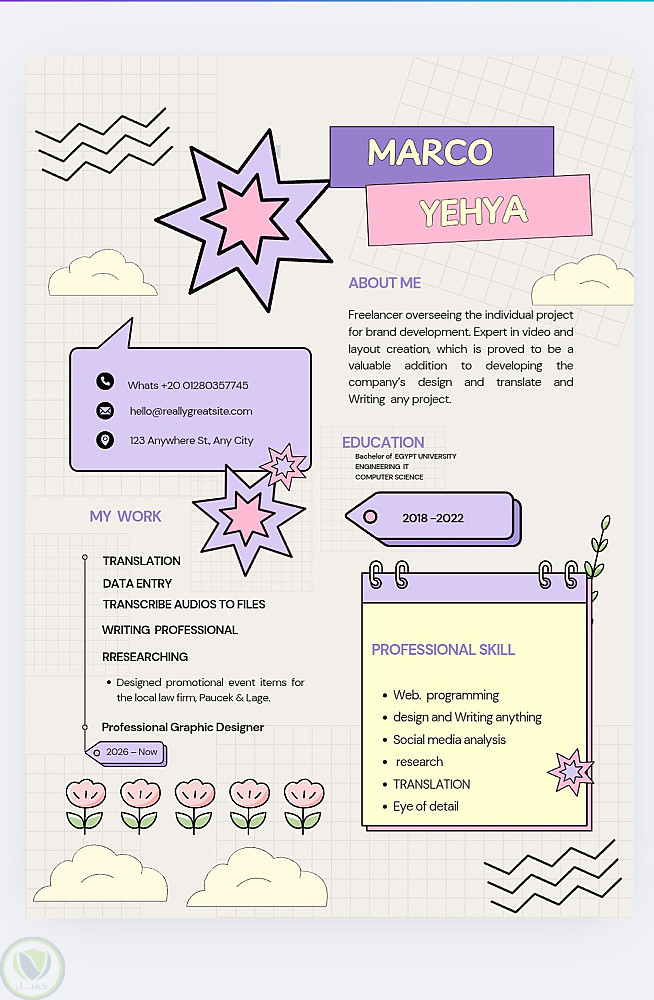 ملف معلومات للتقديم على وظيفة بشكل جميل وبسيط ومنسق وايضا يلخص المهارات والمعلومات المطلوبة من شهادات ومهارات