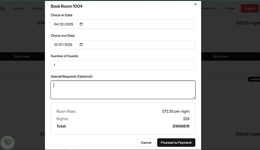 حجز الغرف من قبل العملاء، مع دعم حالة الحجز (معلّق – مؤكد – مُكتمل).