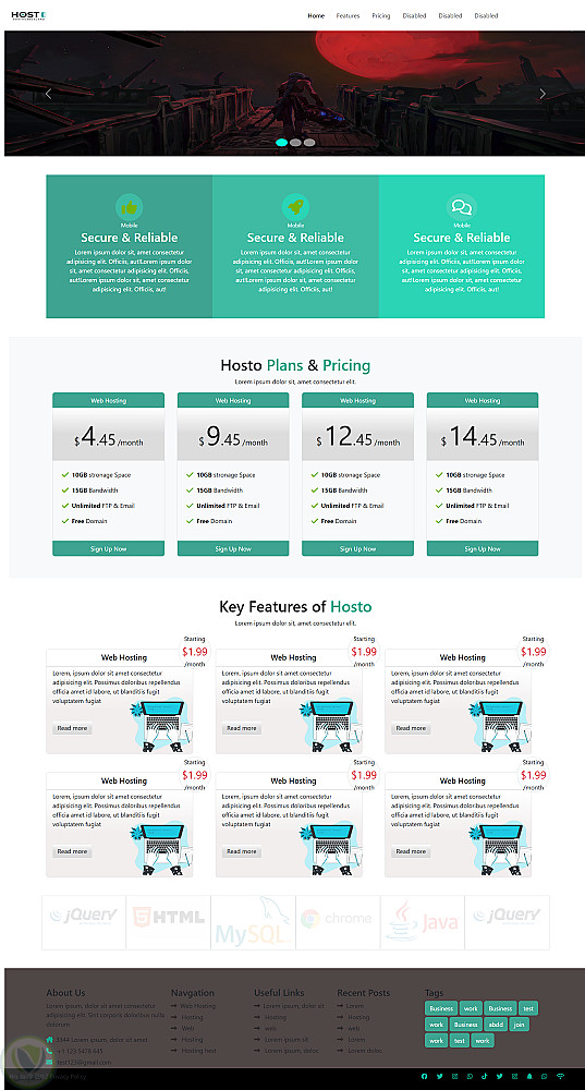 الصفحة يحتوي على تصميم بسيط منظم تحتوى على سبعة اقسام يتضمنوا شريط تنقل علوي، قسم عرض صور متحركة، قسم لعرض الخدمات، وأسعار خطط الاستضافة. كما يضم بطاقات بها تفاصيل إضافية عن الخدمات، وشريط سفلي يحتوي على روابط وشعارات تقنيات مستخدمة.باستخدام html,css,js,bootstrap
