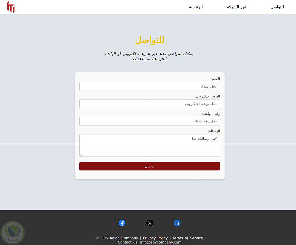 الصفحة تتميز بتصميم احترافي، وألوان متناسقة، وأقسام منظمة لعرض نبذة عن الشركة وخدماتها بشكل واضح وجذاب.