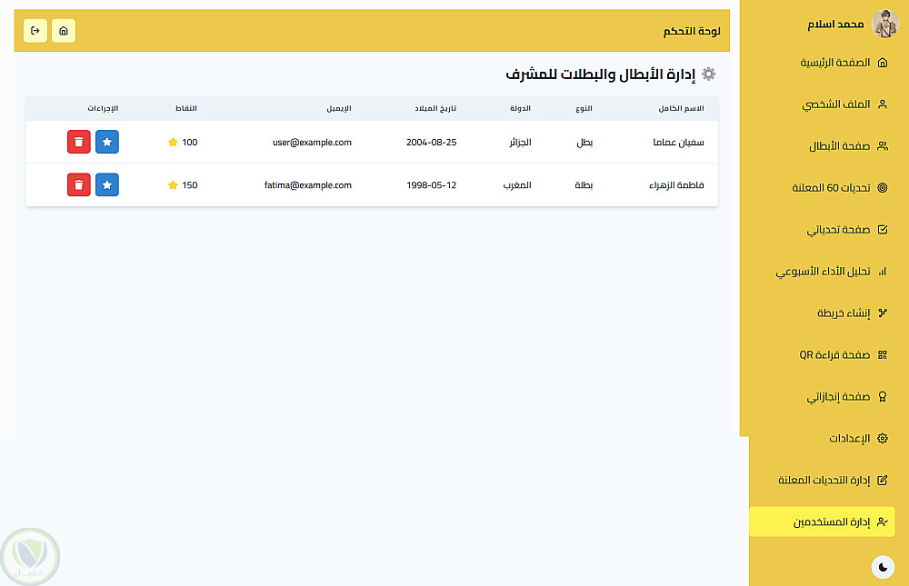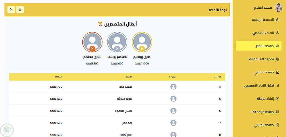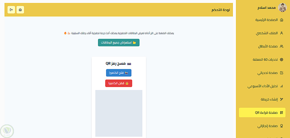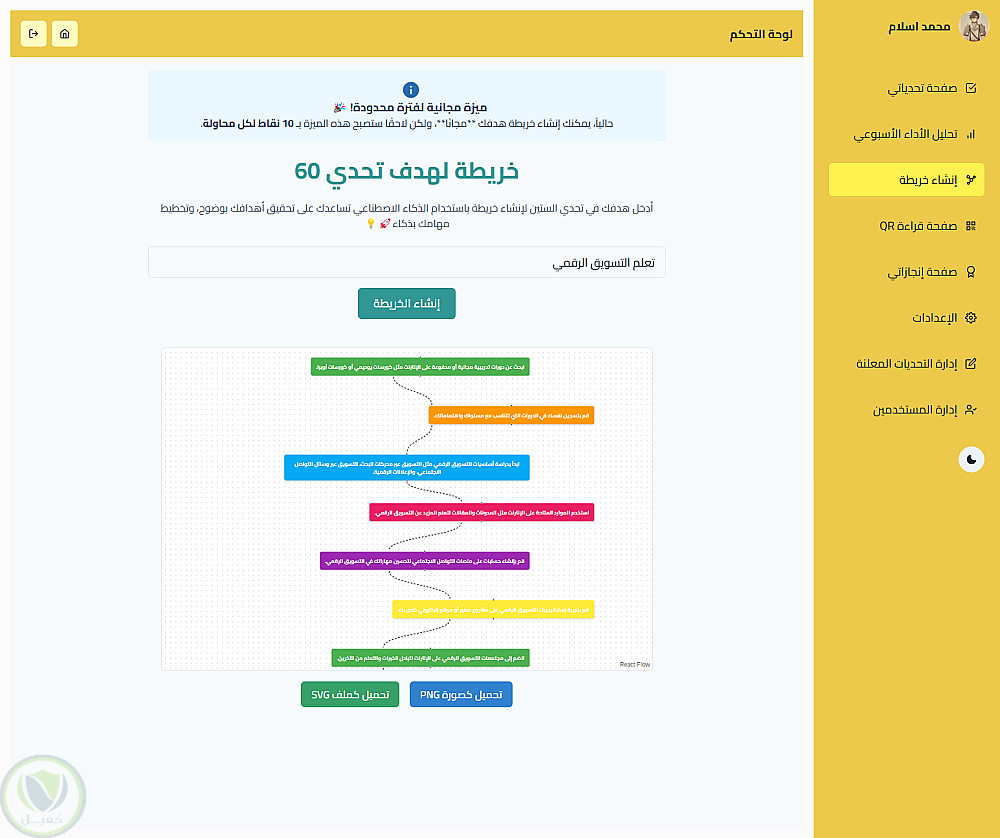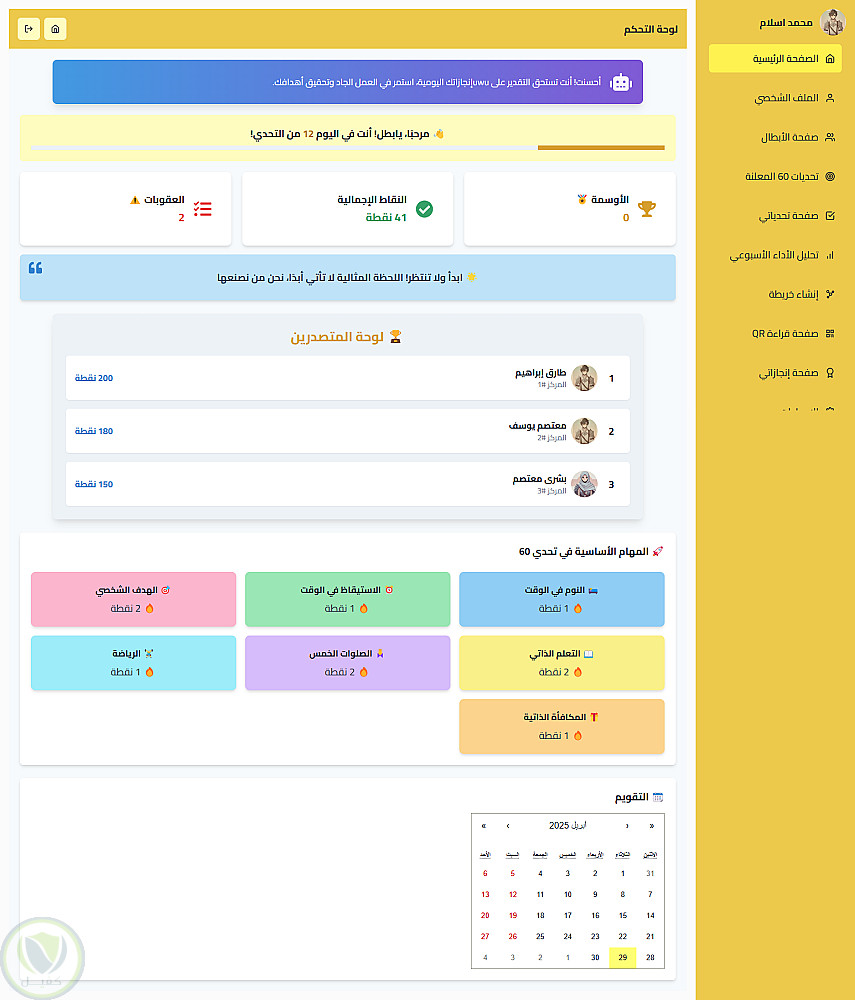 "تحدي 60" تطبيق تفاعلي موجه للشباب لتحسين الذات عبر تحديات يومية لمدة 60 يومًا، يدمج الذكاء الاصطناعي التوليدي لتخصيص التجربة. يولد التطبيق رسائل تحفيزية ذكية، توصيات أسبوعية، وخرائط أهداف شخصية بطريقة مرئية. يشمل نظام نقاط، شارات تحفيزية، ولوحة متصدرين لتعزيز التنافس. يتيح اختيار الهوية (بطل/بطلة)، أداء مهام يومية (تعلم، رياضة، صلوات...)، وإضافة عادات مخصصة. يمنح شارات أسبوعية بناءً على الأداء، ويحتوي على QR Code لربط المستخدم بكورس تحفيزي على YouTube. يُظهر أداء المستخدم بإحصائيات ورسوم توضيحية، مع إمكانية حفظ خريطة الهدف كصورة. التطبيق يقدم تجربة شخصية محفزة ببُعد اجتماعي يشجع على مشاركة الإنجازات وبناء عادات إيجابية ضمن مجتمع داعم.