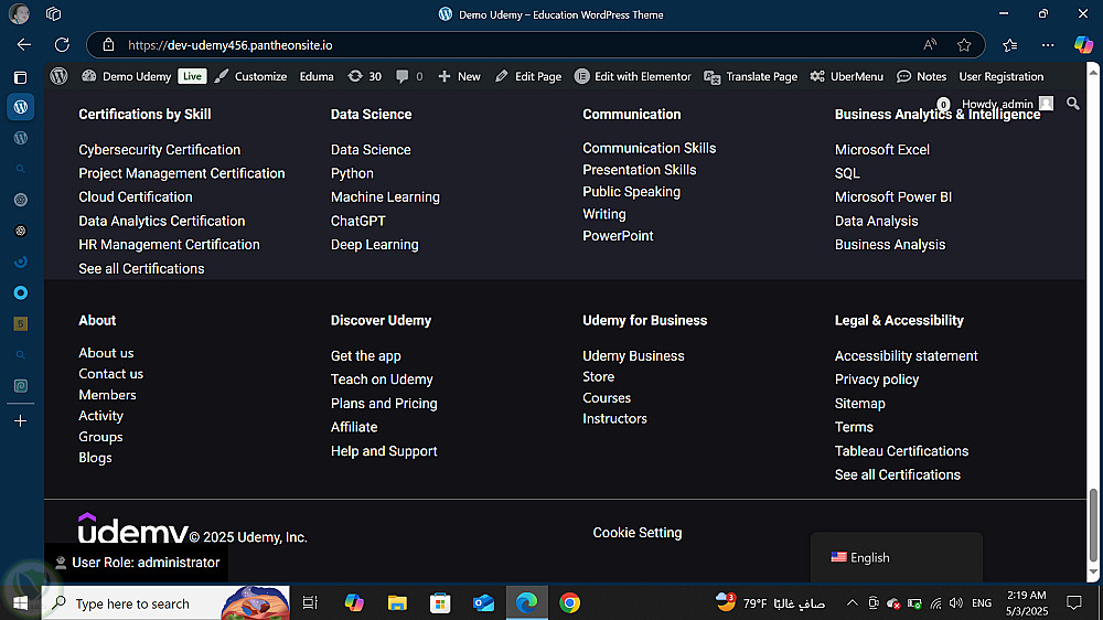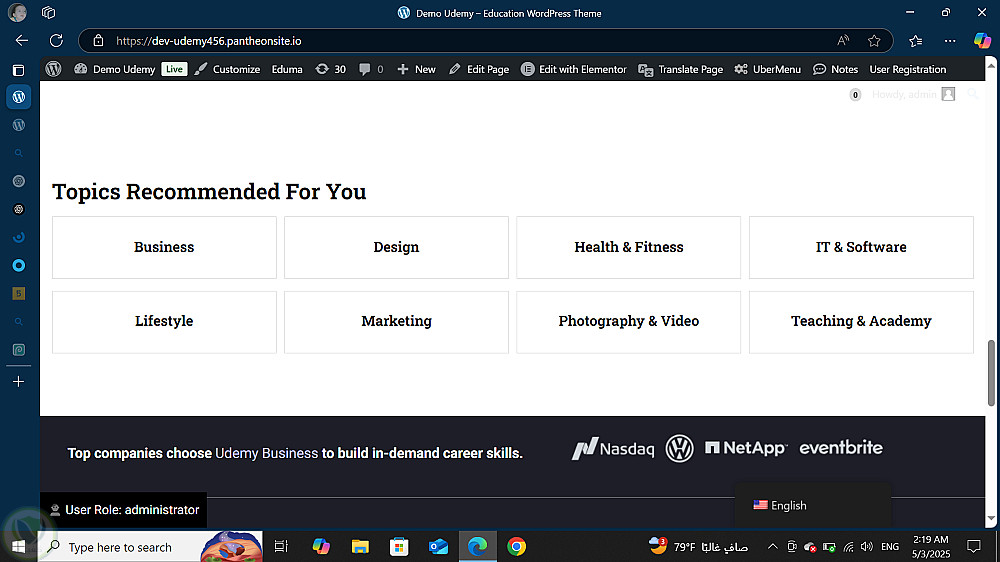 تم تنفيذ منصة تعليمية إلكترونية متكاملة تحاكي موقع Udemy الشهير، باستخدام ووردبريس فقط وبدون أي برمجة مخصصة، مع التركيز على التصميم الاحترافي وسهولة الاستخدام. تم الاعتماد على قالب Eduma وإضافة LearnPress لتوفير جميع خصائص التعليم الإلكتروني مثل: