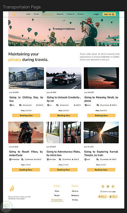 م تصميم الواجهة باستخدام Figma مع التركيز على تجربة المستخدم البسيطة. الصفحة الرئيسية تحتوي على بانر كبير يعرض وجهات سياحية مشهورة مع أزرار دعوة للعمل. تحت البانر، يوجد قسم الرحلات مع بطاقات تحتوي على تفاصيل الرحلات مثل الوجهة والسعر، مع إمكانية التصفية حسب الفئة أو الوجهة. أسفل الصفحة، يوجد تذييل بسيط يحتوي على روابط للتواصل والسياسات.