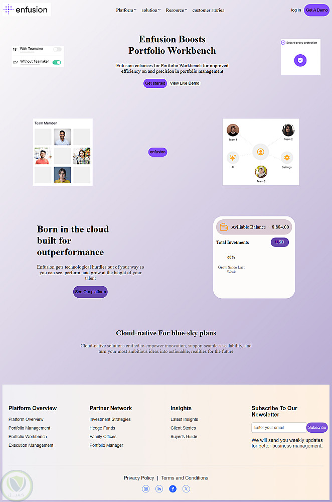 هيدر: شعار enfusion + روابط للتنقل (Platform, Solution, Resources, Customer Stories) + زر Get A Demo.