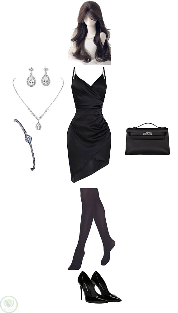 إطلالة ساحرة تجمع بين الفستان الأسود الحريري الأنيق والشارب الناعم، مع لمسات فاخرة من سلسلة الماس والأسوارة التي تضيف بريقاً خاصاً.