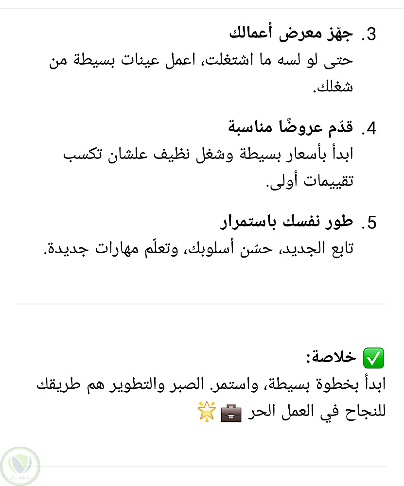 مقال حصري من كتابتي، يشرح خطوات بدء العمل الحر للمبتدئين بأسلوب واضح وسلس، مناسب للمدونات أو المواقع التي تقدم محتوى تعليمي.