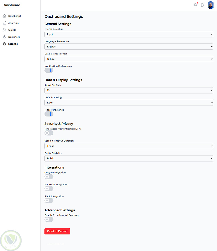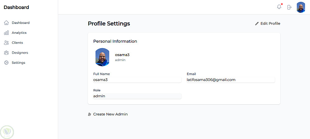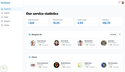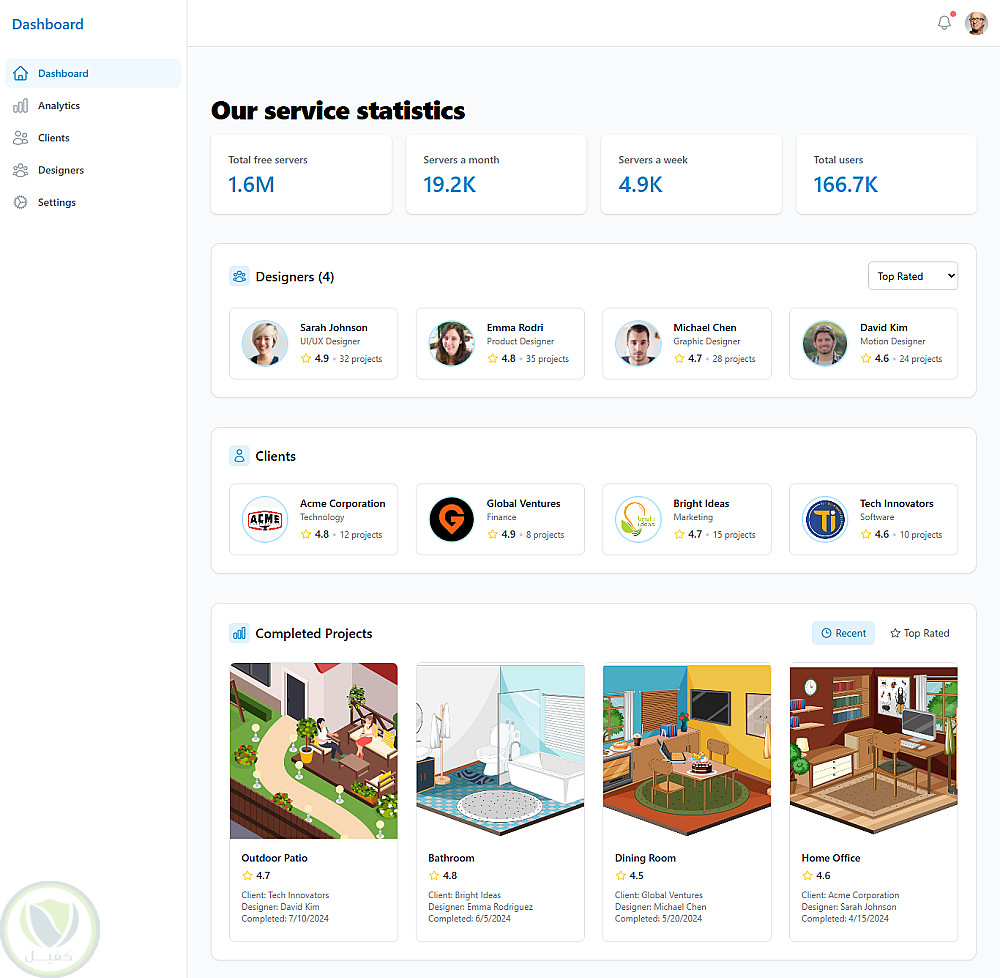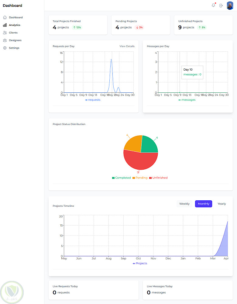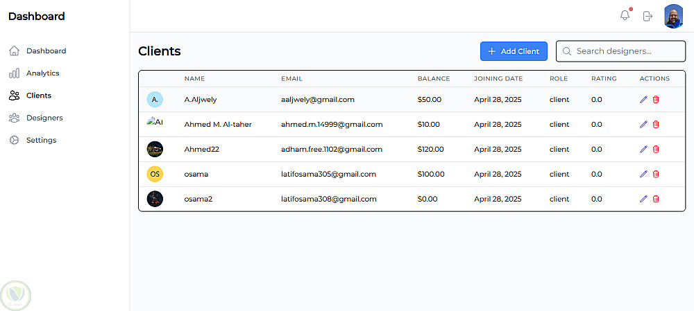 قمت بتطوير لوحة تحكم إدارية، مصممة لإدارة العملاء، المصممين، المشاريع، التحليلات، وإعدادات الموقع بكفاءة. توفر الداشبورد واجهة مستخدم سهلة وتفاعلية تمكن الإداريين من تنظيم العمليات اليومية، متابعة أداء المشاريع، وتحليل البيانات لتحسين تجربة المستخدم. تم تصميم اللوحة لتكون متجاوبة وآمنة، مع التركيز على الأداء العالي وسهولة الاستخدام.
