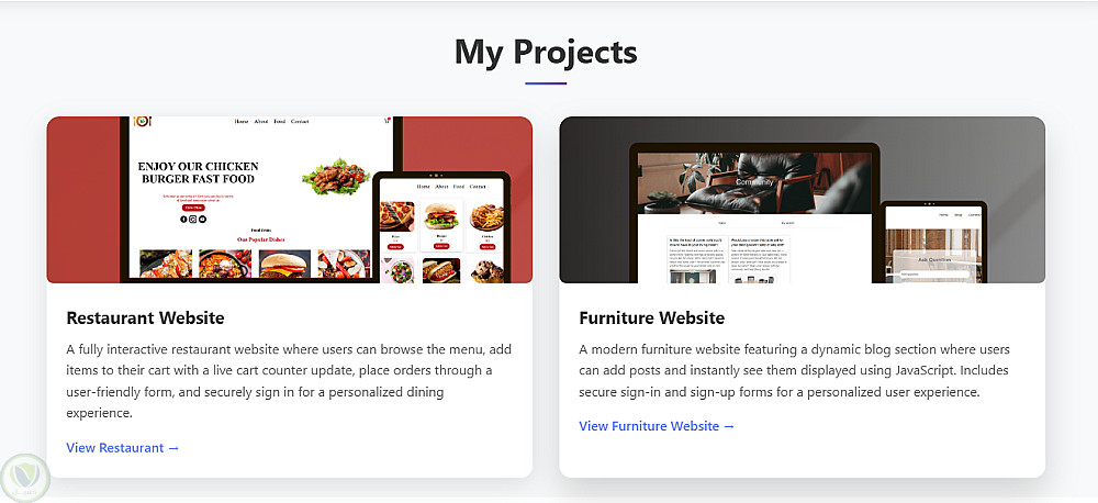 القسم الثاني يتضمن عرضًا لأبرز مشاريعي السابقة، مع صور وروابط مباشرة لعرض تفاصيل كل مشروع، بحيث يمكن للعملاء أو أصحاب العمل التعرف على جودة أعمالي بسهولة.