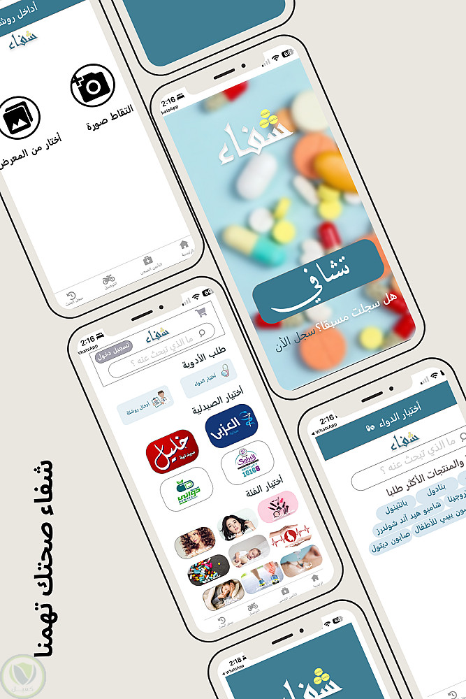 تطبيق "شفاء"، هو تطبيق طبي يقوم بجمع الصيدليات المختلفة و يتيح للمستخدمين رفع وصفاتهم الطبية، البحث عن الأدوية، واختيار الصيدلية الأقرب، مع إمكانية طلب التوصيل للمنازل.