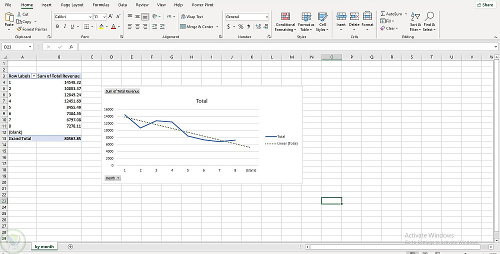 تم إنشاء Pivot Table لعرض إجمالي الإيرادات الشهرية على مدار السنة، حيث يوضح الجدول القيم الشهرية بالتفصيل مع حساب الإجمالي الكلي والذي بلغ 80,567.85.