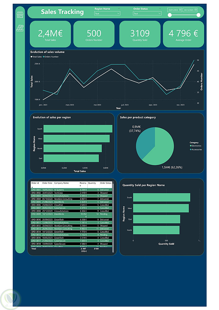 يُظهر المخطط الخطي المركزي 'Evolution of Sales volume' تحليل الاتجاهات على مدار العام (من يناير إلى ديسمبر 2023), حيث يجمع هذا الرسم البياني بين محورين 'Total Sales' والمحور الثانوي 'Orders Number' لمقارنة كيفية تأثير عدد الطلبات على إجمالي المبيعات بمرور الأشهر.