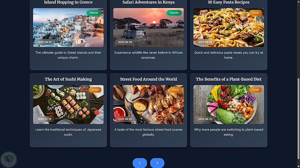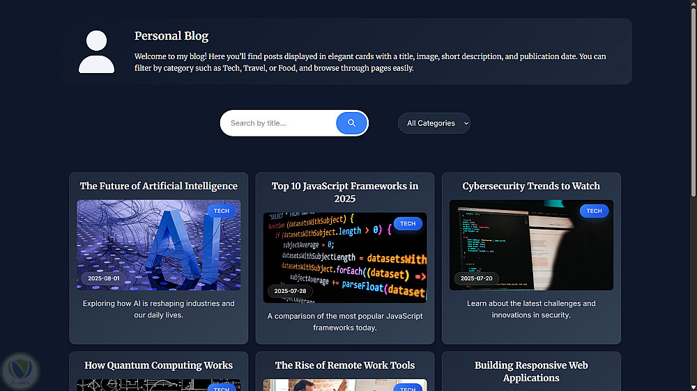 مجموعة من تطبيقات الويب العملية تشمل صفحة هبوط (Landing Page)، ومدوّنة شخصية، ولوحة معلومات للطقس (Weather Dashboard). تبرز هذه المشاريع استخدام تصميم واجهات حديثة بتقنية React وTailwind CSS، إلى جانب دمج واجهات برمجية (API Integration)، وإدارة الحالة (State Management)، وبناء مكوّنات قابلة لإعادة الاستخدام.