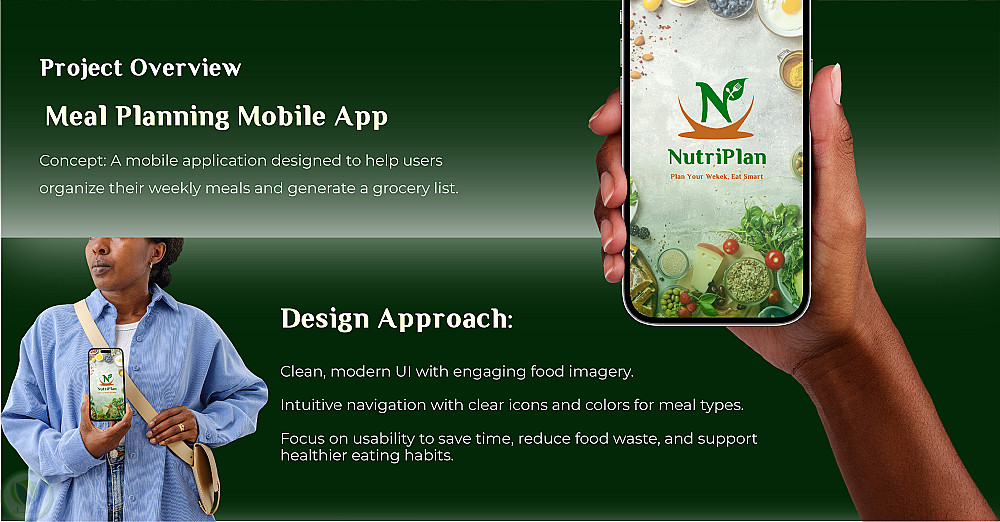 قمت بتصميم واجهة مستخدم لتطبيق NutriPlan، وهو تطبيق يهدف إلى مساعدة المستخدمين في تنظيم وجباتهم الأسبوعية وبناء عادات غذائية صحية، من خلال تجربة استخدام بسيطة وواضحة تعتمد على مبدأ Mobile-First Design لضمان سهولة التصفح على الهواتف الذكية.