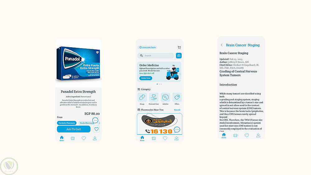 يتيح تسجيل الدخول، البحث بالاسم أو الصورة، عرض أقرب صيدليات، إضافة للمفضلة والسلة، ودردشة مع بوت للمساعدة.