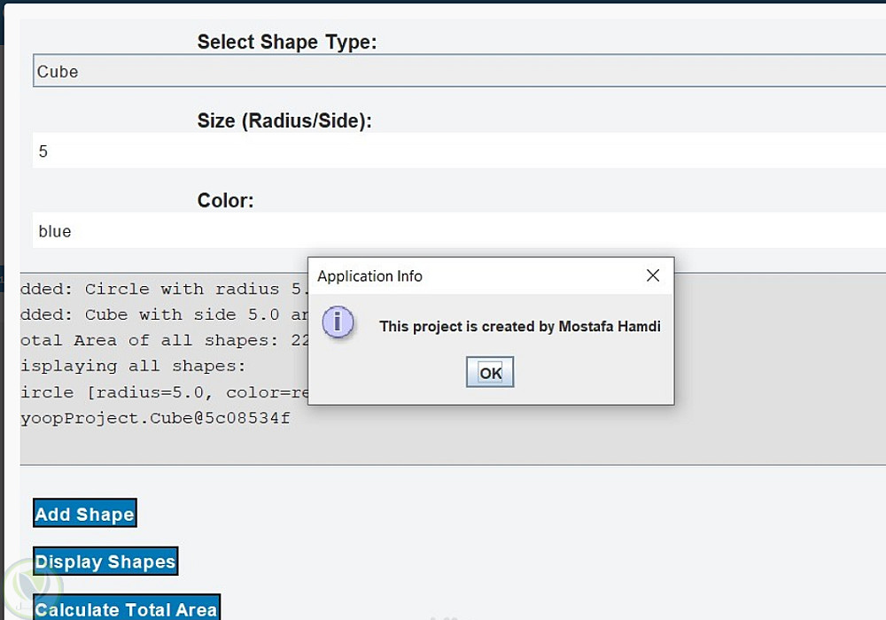 تم تطوير تطبيق سطح مكتب يعتمد على البرمجة كائنية التوجه (OOP) باستخدام لغة Java. يحتوي التطبيق على واجهة رسومية (GUI) تتيح للمستخدم اختيار شكل هندسي (مثل الدائرة أو المربع)، وإدخال الأبعاد المطلوبة، ليقوم البرنامج تلقائيًا بحساب المساحة والمحيط.