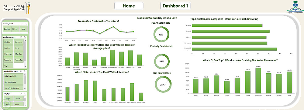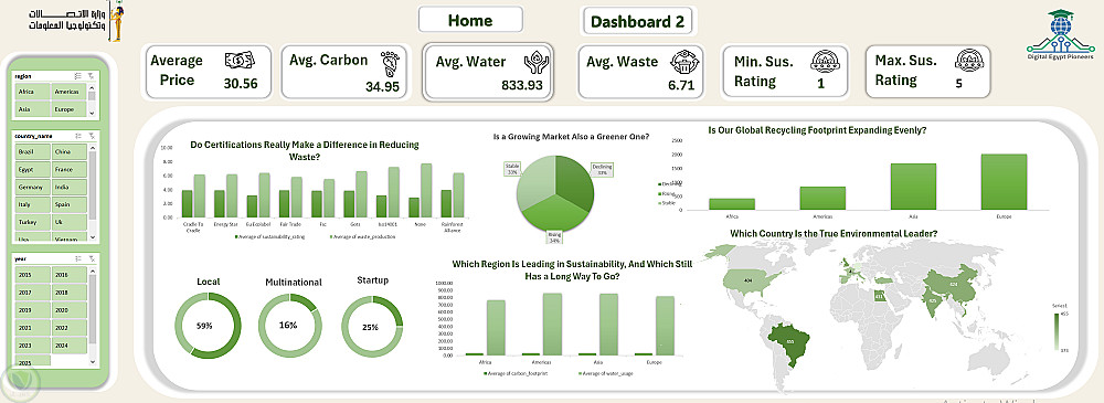 قمت بتنفيذ مشروع تحليلي شامل لتقييم الأداء البيئي والاقتصادي للكيانات والمنتجات على مستوى عالمي. ركز التحليل على خمسة مؤشرات أداء رئيسية (كالكربون، المياه، والنفايات) وتضمن بناء لوحات تحكم تفاعلية. كشفت النتائج عن مسار الاستدامة العالمي (بنسبة 39% مستدام بالكامل)، وأفضل قيمة مقابل السعر في فئات المنتجات، والمواد الأكثر استهلاكاً للمياه. الهدف هو تزويد الإدارة العليا برؤى حاسمة لتوجيه الاستثمار نحو الأسواق المستدامة، وتحسين الكفاءة البيئية، والمقارنة بالأداء العالمي