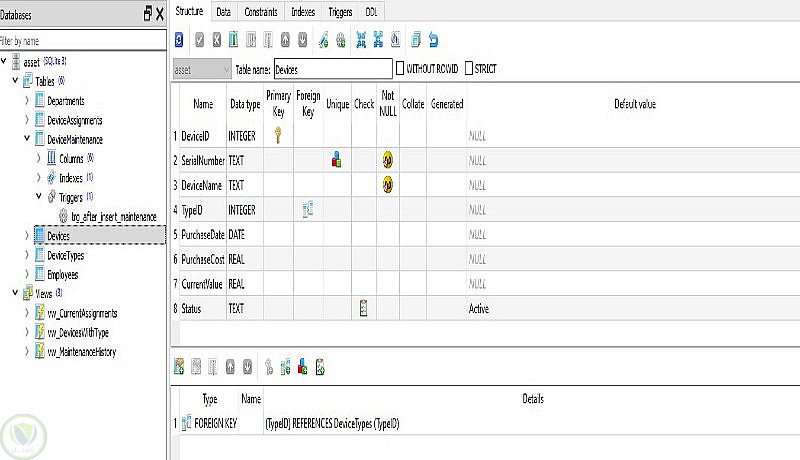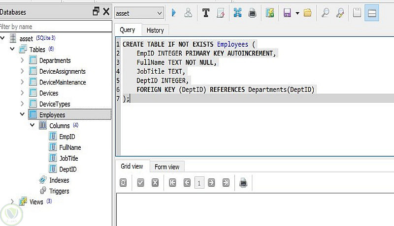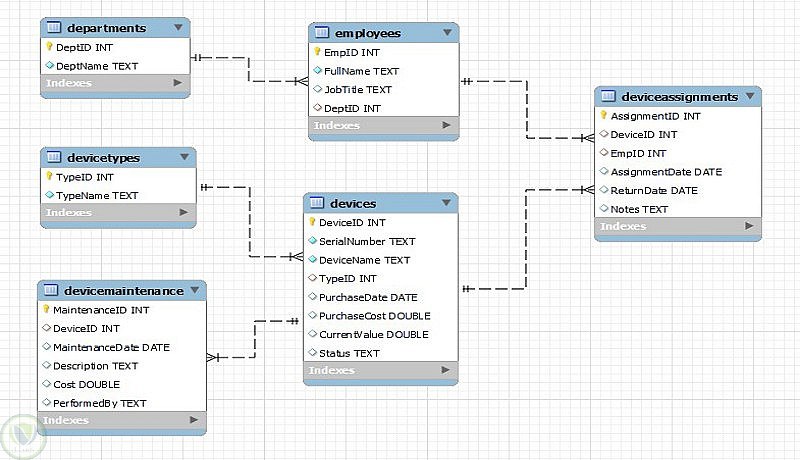 قاعدة بيانات مصممة باستخدام SQLite لإدارة ومتابعة الموارد من جميع الأجهزة (لابتوب، أجهزة مكتبية، طابعات، خوادم، أجهزة موبايل …) داخل الجهة الإدارية، مع تسجيل: