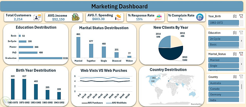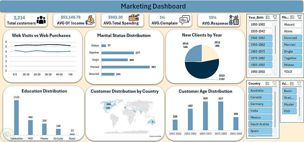 ? "لوحة تحكم تفاعلية (Marketing Dashboard) توضح أهم مؤشرات الأداء في التسويق مثل عدد العملاء، متوسط الدخل، الإنفاق، معدل الاستجابة، ونسبة الشكاوى، مع تحليل تفصيلي لتوزيع التعليم والحالة الاجتماعية وسنوات الميلاد."