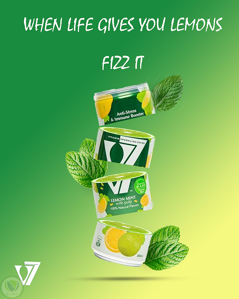 تصميم إعلان بصري جذاب وذو طابع حيوي لمشروب V7 (فيتامين سباركلينج درينك).