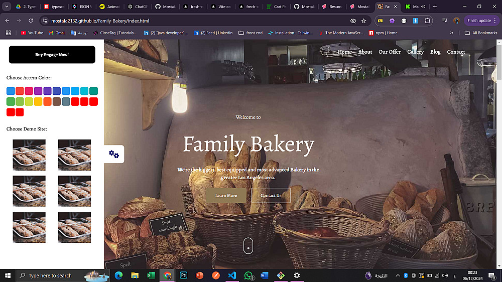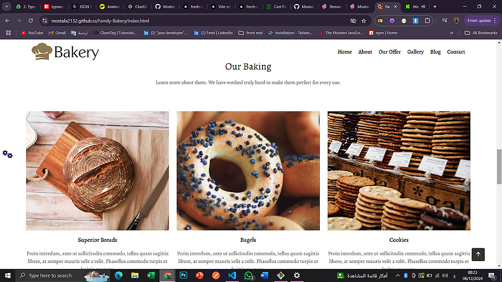 موقع فيه عدت صفحات من خلالها اعرض منتاجات الي بيقدمها المخبز واسعار الحاجه وتاريخ المخبز ومواعيد العمل واي شي يخص المخبز بالاضافه انك تقدر تغير الوان الموقع كلها وفيه انمشين كويس بيظهر بيه الموقع
