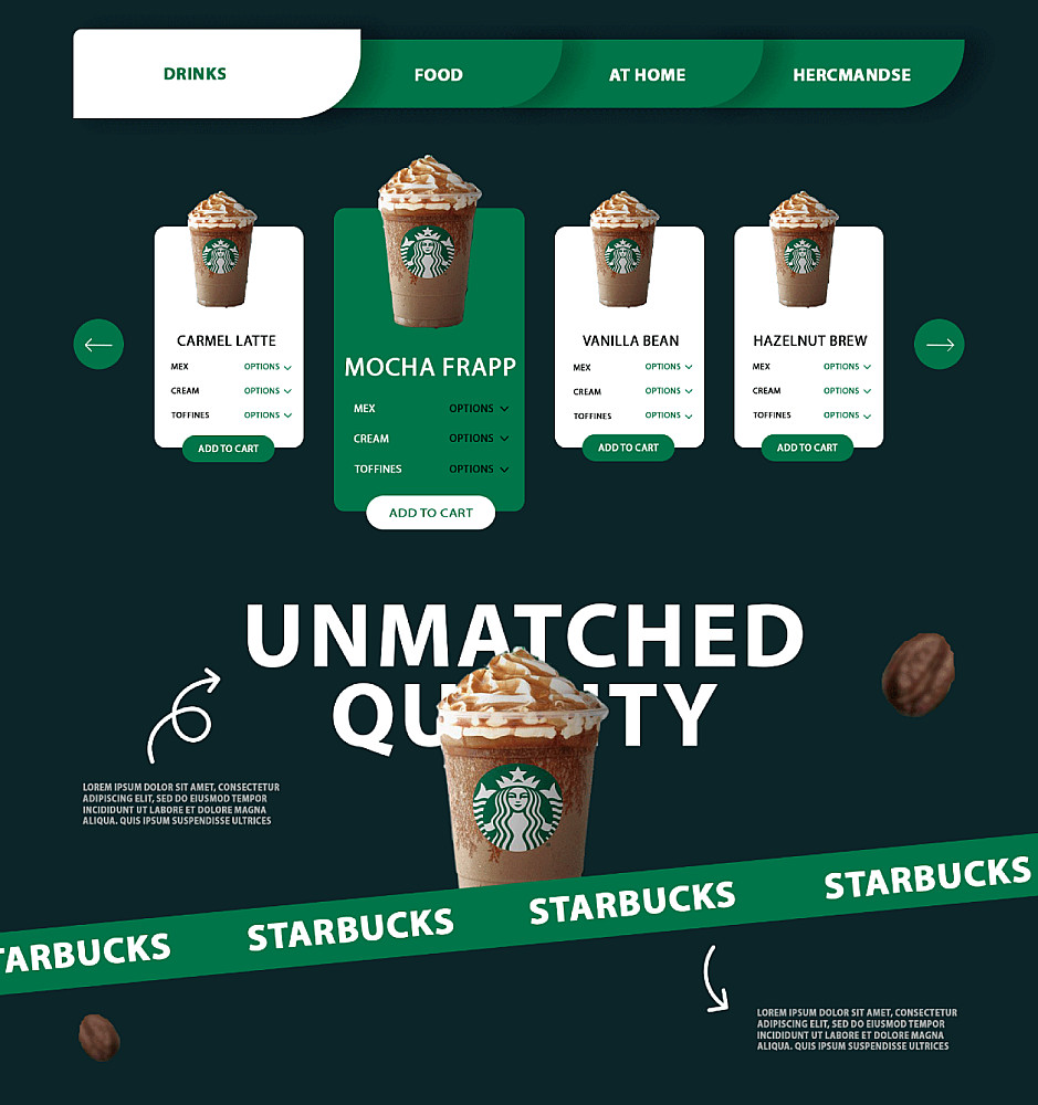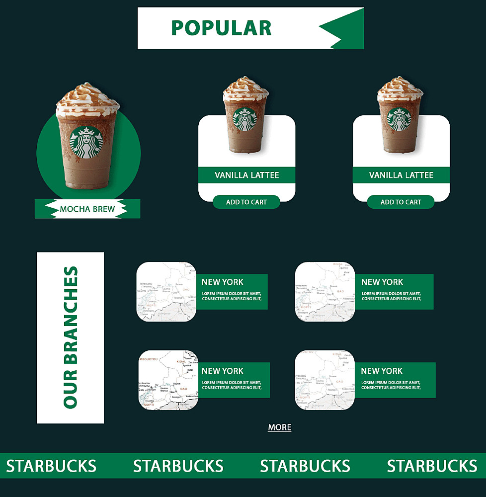 سأعتمد على تصميم حديث مستوحى من ستايل ستاربكس، يركز على الألوان المميزة والعناصر البصرية الجذابة، بحيث يترك الموقع انطباعًا قويًا لدى الزوار ويعبر عن هوية العلامة التجارية بوضوح يتكون من صفحه واحده اساسيه مقسمه الى ٤ اقسام مع امكانيه زياده العدد حسب الطلب و تسليم ملف فيجما .