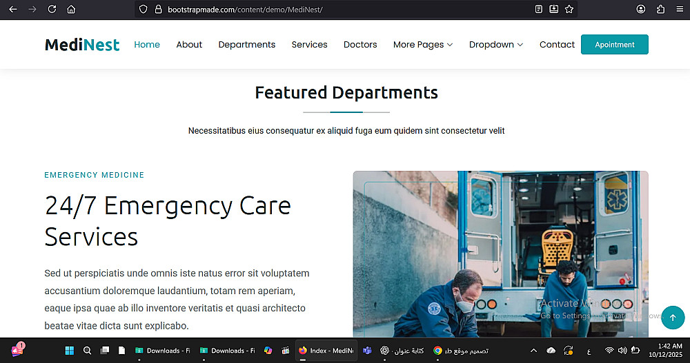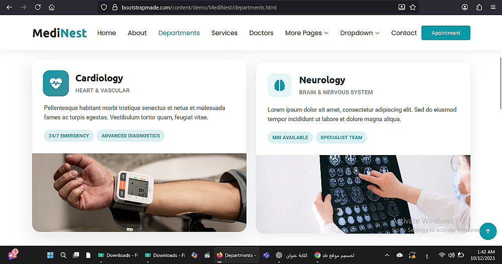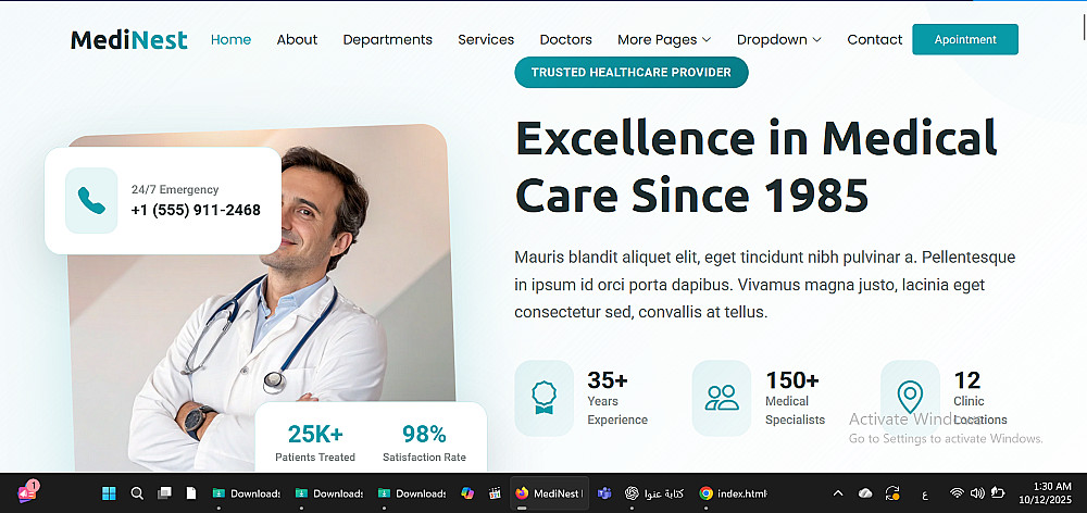 سأقوم بتصميم وبرمجة موقع طبي احترافي مخصص للعيادات أو المستشفيات أو الأطباء، باستخدام HTML وCSS وBootstrap وJavaScript.