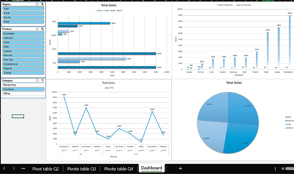 -تصميم Dashboard تفاعلية داخل Excel لعرض الأداء والنتائج بشكل بصري جذاب وسهل الفهم.