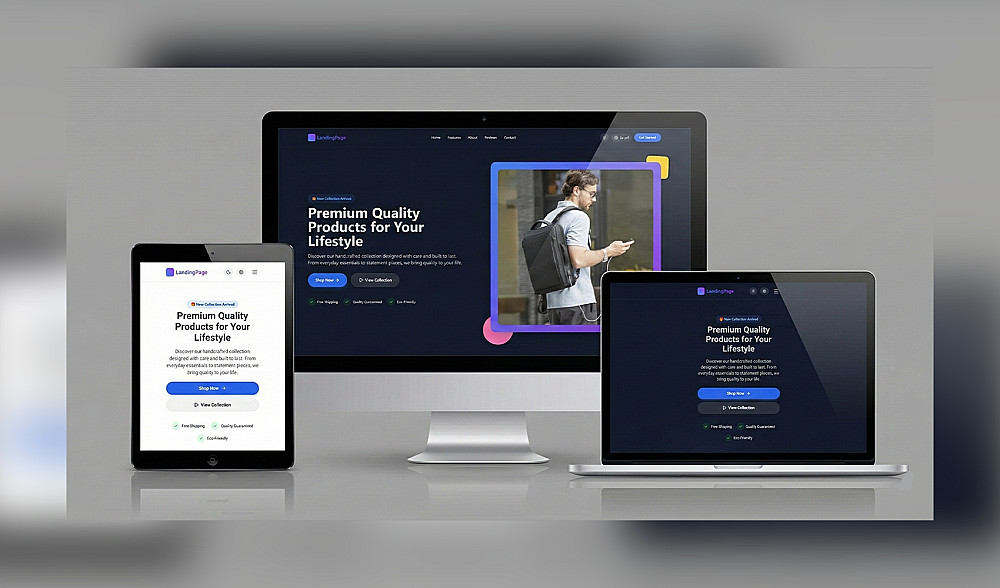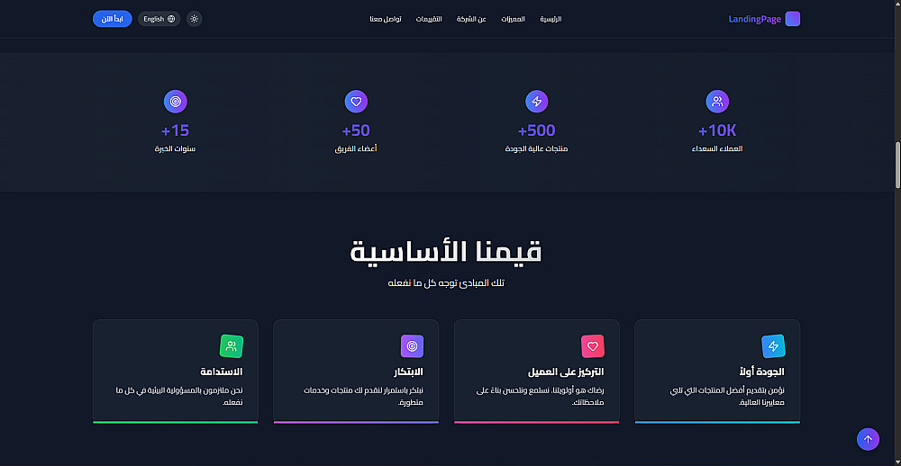 صفحة هبوط احترافية لعرض متجرك ومميزاته واراء العملاء به وايضا المواقع مناسب لجميع الشاشات ويعمل باللغتين العربية والانجليزية ويحتوي ايضا علي الوضع الداكن والوضع الفاتح كما ان الموقع تفاعلي مع المستخدم مما يعر الزائر انه يتعامل مع شي احترافي