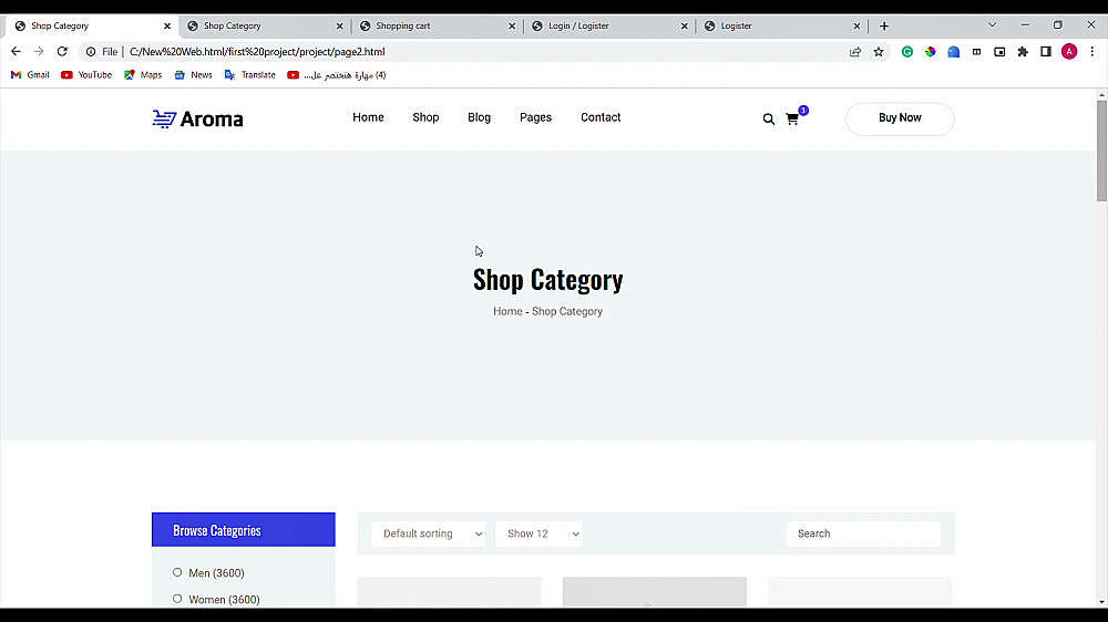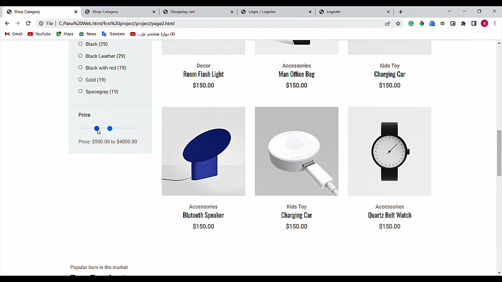 صفحة المتجر (Shop Category): تصميم واجهة عرض المنتجات مع شريط مدى الأسعار (Price Slider) و فلتر الماركات (Filters) .