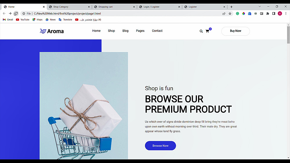 عناصر عامة: بناء شريط تنقل علوي (Navbar) متكامل يشمل أيقونات البحث والسلة (Cart) وزر الشراء (Buy Now).
