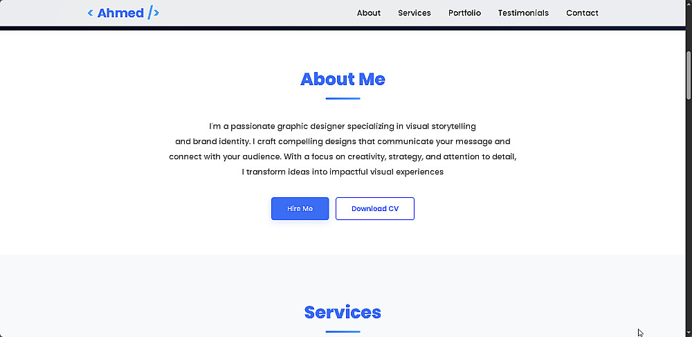 يحتوي على 5 أقسام رئيسية ( نبذة – المهارات – الأعمال – اراء العملاء - التواصل ).