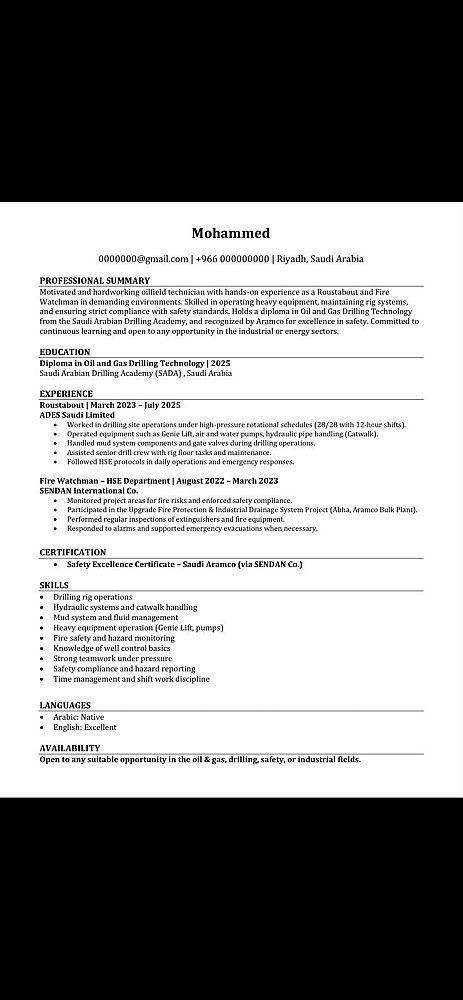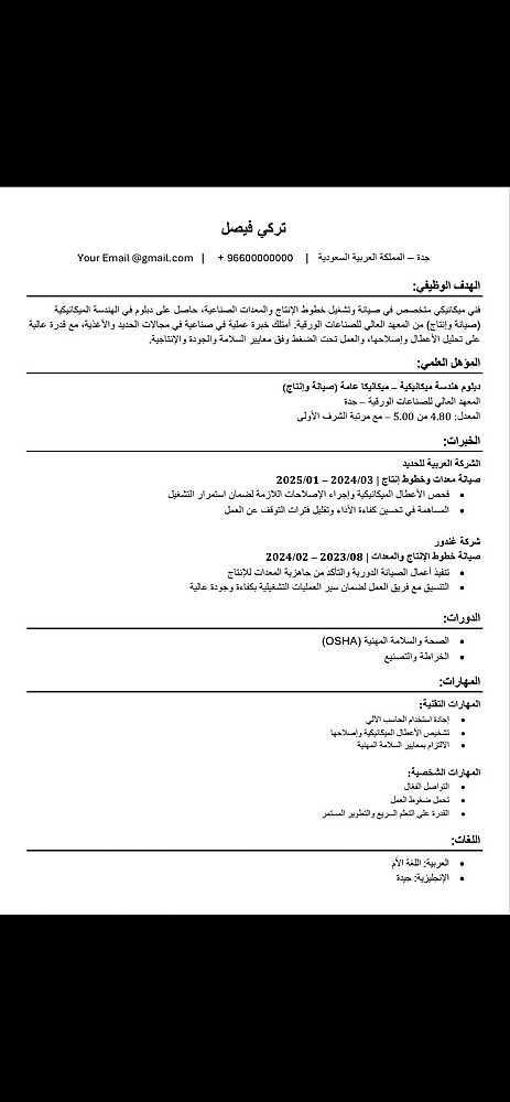 أقدّم خدمة كتابة وتصميم السيرة الذاتية (CV) بشكل احترافي ومتوافق مع نظام ATS، مع خبرة في إعداد السير الذاتية الخاصة بسوق العمل السعودي والخليجي.