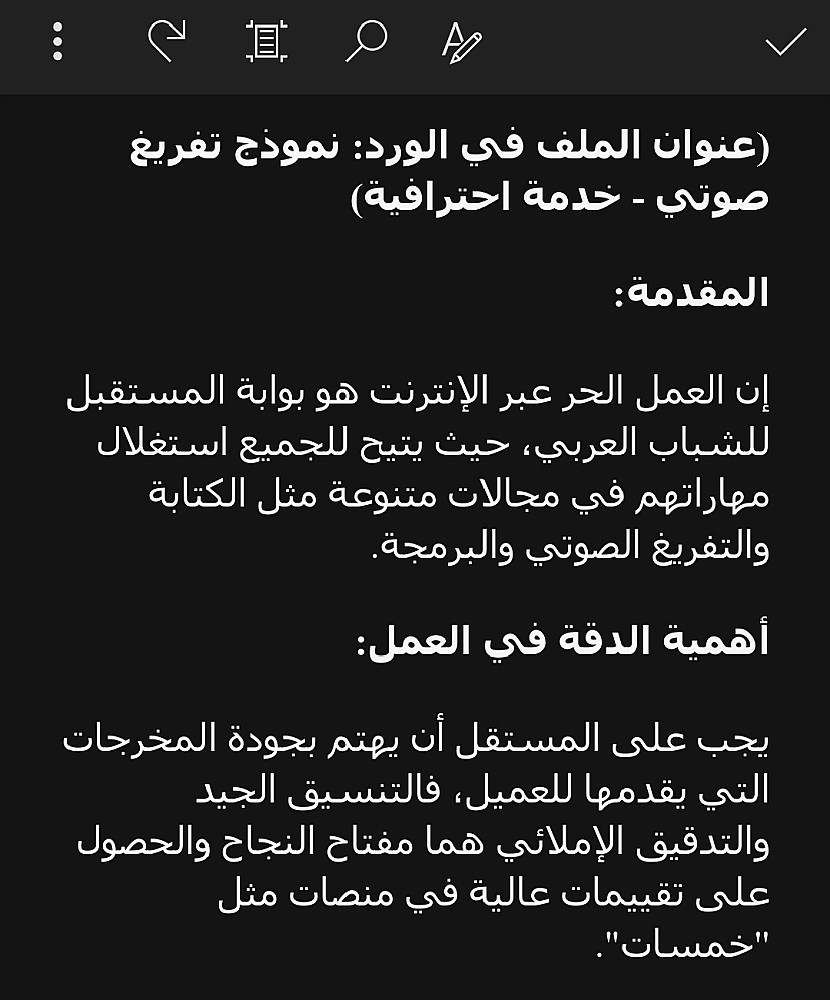 أقدم لكم خدمة تحويل المقاطع الصوتية والفيديوهات إلى نصوص مكتوبة ومنسقة بأسلوب احترافي.