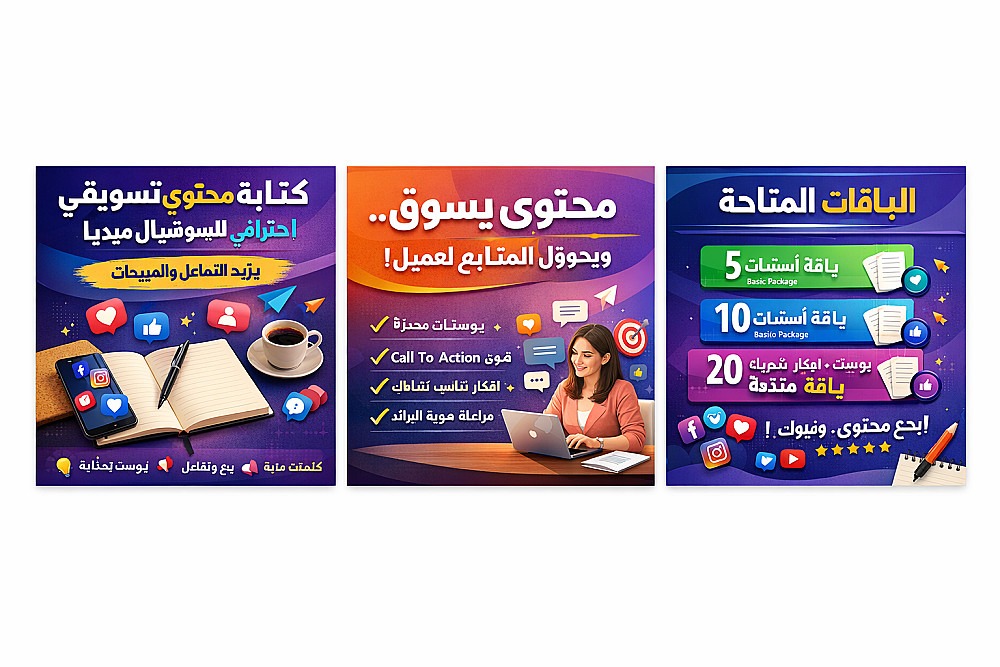 خدمة كتابة بوستات احترافية للسوشيال ميديا بأسلوب جذاب ومناسب لجمهورك. تشمل كتابة بوست واحد بعدد كلمات حوالي 100 كلمة، مع مراعاة هدف المحتوى وطبيعة النشاط.