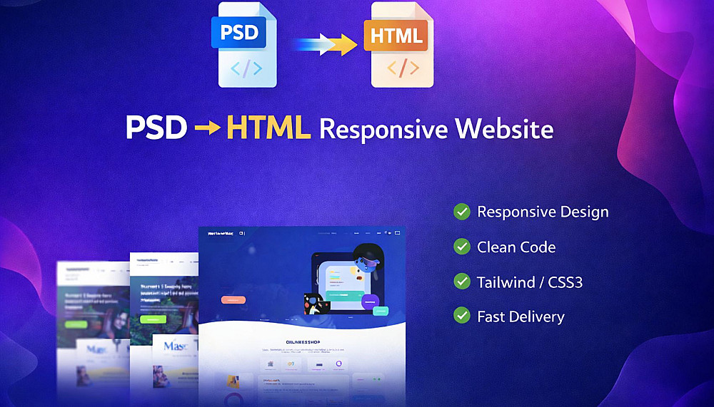 أقدم خدمة احترافية لتحويل أي تصميم PSD إلى موقع HTML متكامل بكود نظيف ومنظم ومتوافق مع جميع الأجهزة والشاشات و محركات البحث. أحرص على تنفيذ التصميم بدقة عالية مع الاهتمام بالتفاصيل وسرعة الأداء لضمان أفضل تجربة استخدام.