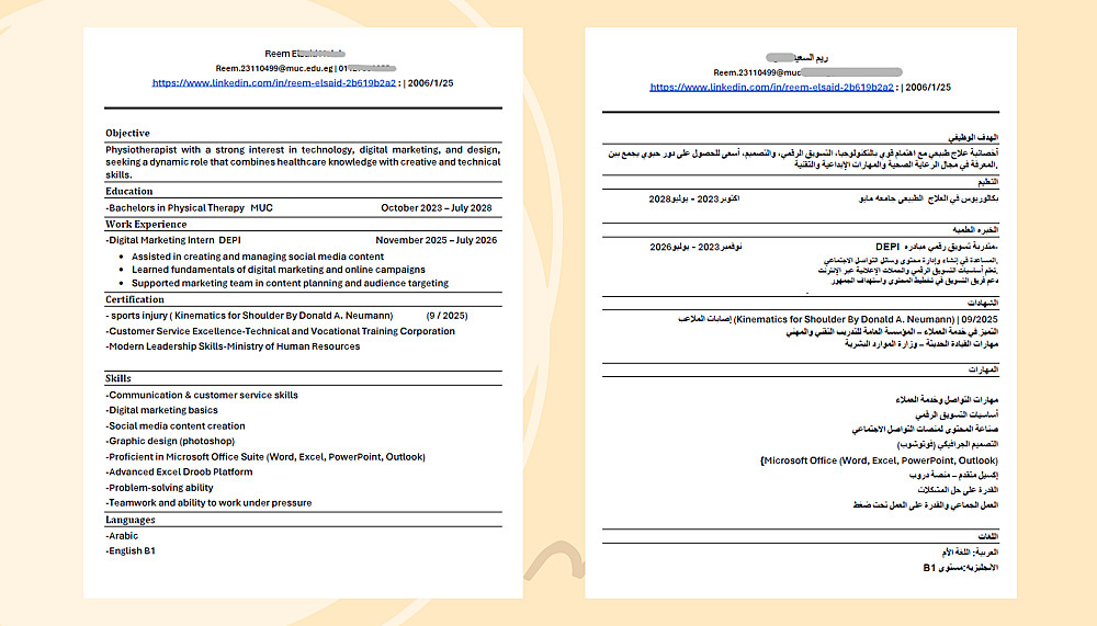 1- سيرة ذاتية صفحتين على شكل ملف PDF جاهز للطباعة، كل صفحة باللغة التي تريدها أو بنفس الصفحة اللغتين معاً.