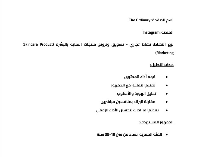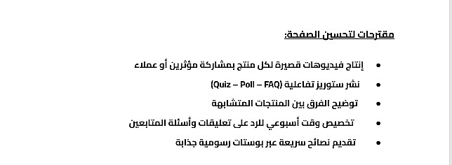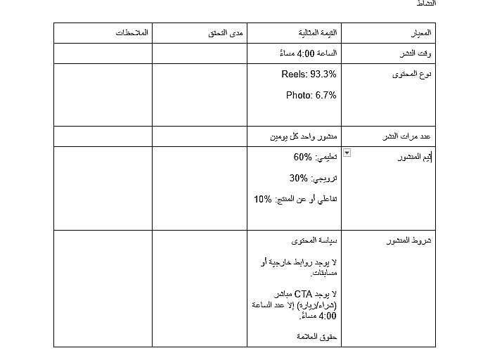 - يشمل تقييم الأداء العام، تحليل المحتوى والتفاعل، وتقديم تقرير مختصر (2–3 صفحات PDF) مع توصيات عملية قابلة للتطبيق.