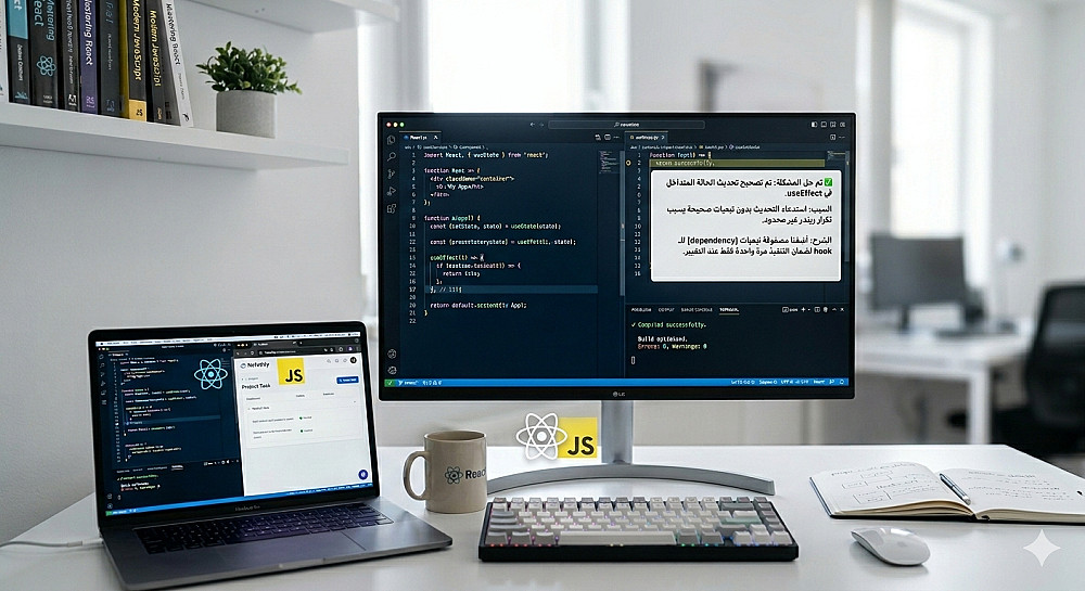 أعمل على مشاريع React و JavaScript وأتعامل مع الأخطاء البرمجية بشكل عملي ومنهجي، سواء كانت مشاكل في: