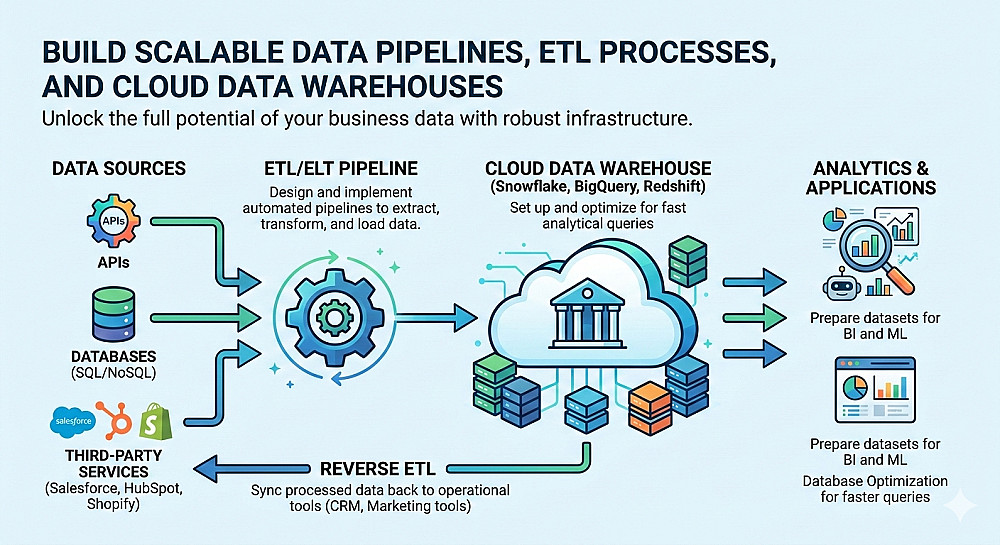 البيانات هي أساس الأعمال الحديثة، ولكن البيانات الخام غالبًا ما تكون غير منظمة. أساعد الشركات على إطلاق العنان للإمكانات الحقيقية لبياناتها من خلال بناء بنية تحتية قوية وقابلة للتوسع والصيانة. سواء كنت بحاجة إلى نقل البيانات من مصادر معزولة إلى مستودع مركزي، أو أتمتة عمليات ETL المعقدة، أو إعداد مجموعات البيانات لتحليلات ذكاء الأعمال (BI) والتعلم الآلي (ML)، يمكنني مساعدتك.
