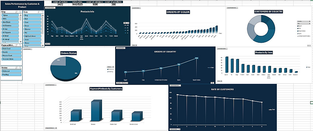 يُقدّم هذا المصنف في برنامج إكسل تحليلاً مُفصّلاً لبيانات مبيعات متجر ملابس إلكتروني يعمل في مصر والعراق والإمارات العربية المتحدة وسوريا والمملكة العربية السعودية. ويتضمن مقاييس مُجمّعة وتفاصيل مثل الطلبات حسب الدولة (على سبيل المثال، أعلى عدد في المملكة العربية السعودية بـ 1214 طلبًا)، وتقييمات العملاء (عدد التقييمات من 1 إلى 10)، وطرق الدفع (على سبيل المثال، الحوالة هي الأكثر شيوعًا بـ 422 مستخدمًا)، وعدد المنتجات حسب نوع الصنف (على سبيل المثال، الجينز هو الأكثر شيوعًا بـ 60 صنفًا)، وحالات الطلبات (2630 طلبًا تم تسليمها مقابل 842 طلبًا قيد الانتظار)، والطلبات حسب اللون (القمصان السوداء بـ 439 طلبًا)، وتفاصيل المنتج حسب المقاس والصنف (جدول محوري يُظهر التوزيع حسب المقاسات S وM وL وXL)، والعملاء حسب الدولة، ولوحة معلومات عامة تُلخّص إجمالي الطلبات (3472)، وإجمالي سعر البيع (14,461,529)، والعملاء (1000)، والمنتجات (388). تتضمن جداول البيانات الأولية الإضافية قوائم بالمنتجات الفردية (مع المعرف، والمنتج، والحجم، واللون)، والطلبات (بما في ذلك معرف العميل، ومعرف المنتج، والكمية، والسعر، والتواريخ، والحالة من عام 2018)، والعملاء (مع الاسم، ورقم الهاتف، والبلد، والمدينة، والتقييم، وطريقة الدفع، والبريد الإلكتروني)، مما يتيح الحصول على رؤى حول الأداء الإقليمي، وسلوك العملاء، واتجاهات المخزون لعناصر مثل القمصان، والقبعات، والمحافظ، والأحذية، والجينز، وغيرها.