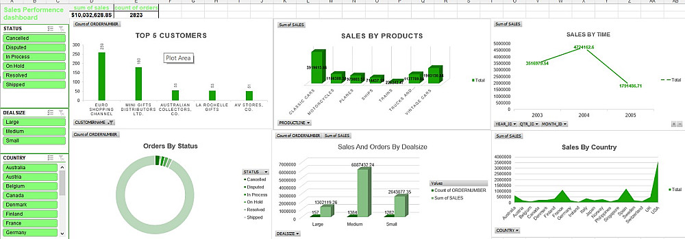 يُعدّ هذا المصنف في برنامج إكسل أداةً شاملةً لتحليل المبيعات لشركة متخصصة في نماذج مصغّرة قابلة للتحصيل، تشمل الدراجات النارية والسيارات الكلاسيكية والطائرات والسفن والقطارات والشاحنات والحافلات والسيارات القديمة. يجمع المصنف بيانات الطلبات التاريخية من عام 2003 إلى عام 2005، مع تفاصيل دقيقة مثل سجلات الطلبات الفردية (مع بيانات العملاء وخطوط الإنتاج وأحجام الصفقات)، وأفضل العملاء أداءً، وتوزيعات حالة الطلبات (مثل: تم الشحن، تم الإلغاء)، وملخصات المبيعات حسب فئة المنتج، وحجم الصفقة (صغير، متوسط، كبير)، والفترات الزمنية (الإجمالي السنوي)، والمناطق الجغرافية (حسب البلد). توفر لوحة المعلومات مؤشرات أداء رئيسية عالية المستوى مثل إجمالي المبيعات (10,032,628.85 دولارًا أمريكيًا) وعدد الطلبات (2,823)، مما يتيح الحصول على رؤى سريعة حول أداء الأعمال والاتجاهات والمؤشرات الرئيسية لاتخاذ القرارات الاستراتيجية.