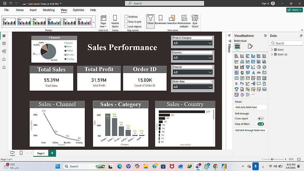 سأقوم بإنشاء Sales Performance Dashboard احترافي يعرض أهم مؤشرات أداء المبيعات مثل إجمالي المبيعات، مقارنة الأداء، واتجاهات النمو.