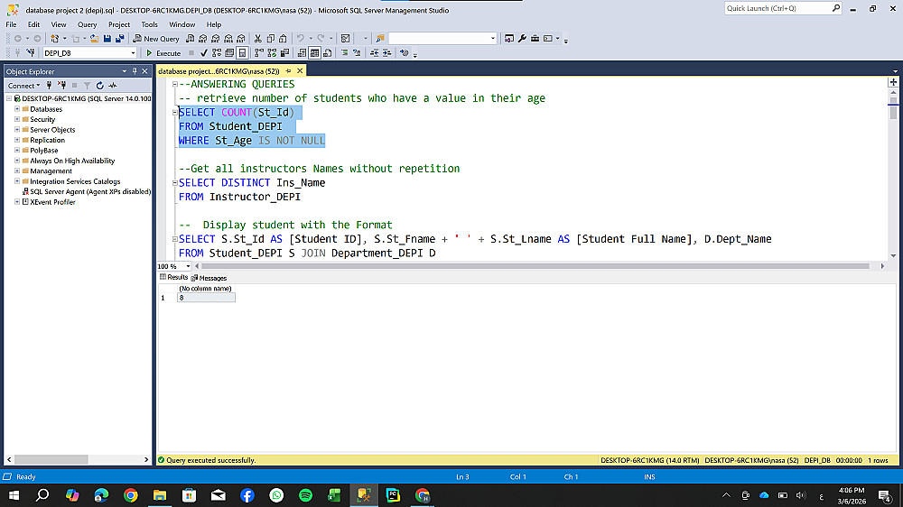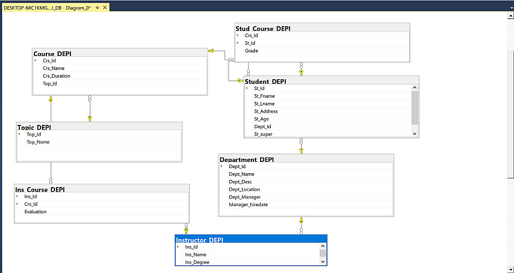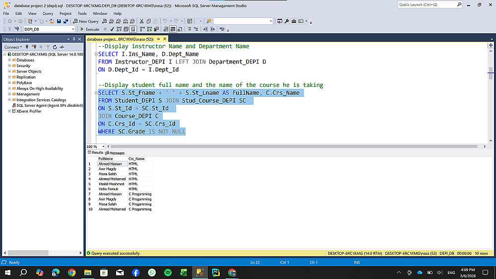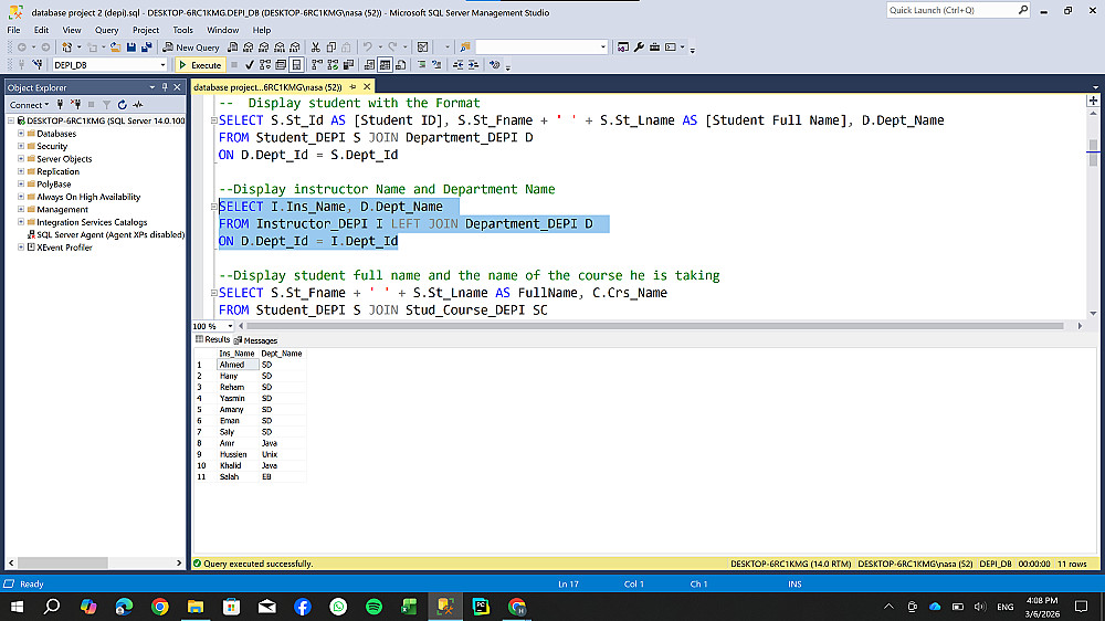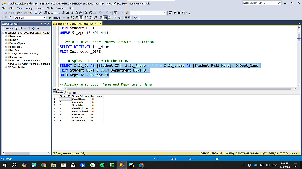 تصميم وهيكلة قاعدة بيانات شاملة لإدارة نظام تعليمي (طلاب، كورسات، أقسام) ، مع التركيز على بناء علاقات منطقية تضمن سلامة البيانات وسهولة استرجاعها.
