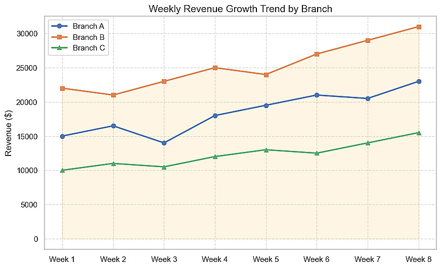 تحليل نمو المبيعات: مراقبة التغير الأسبوعي والشهري لكل فرع لاكتشاف الفروع ذات الأداء الضعيف ومعالجة المشكلة فوراً.