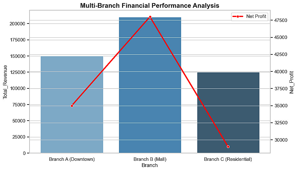 تحليل الكفاءة التشغيلية: مقارنة الفروع من حيث (صافي الأرباح، عدد العملاء، ومتوسط قيمة الفاتورة).