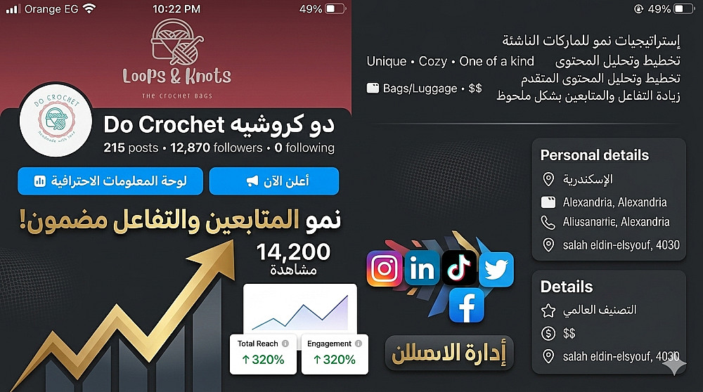 سأقوم بإدارة حساباتك على منصات مثل فيسبوك وإنستجرام بطريقة منظمة وجذابة من خلال إنشاء محتوى مناسب لهوية علامتك التجارية، وتصميم منشورات احترافية تساعد على جذب الانتباه وبناء علاقة قوية مع جمهورك.