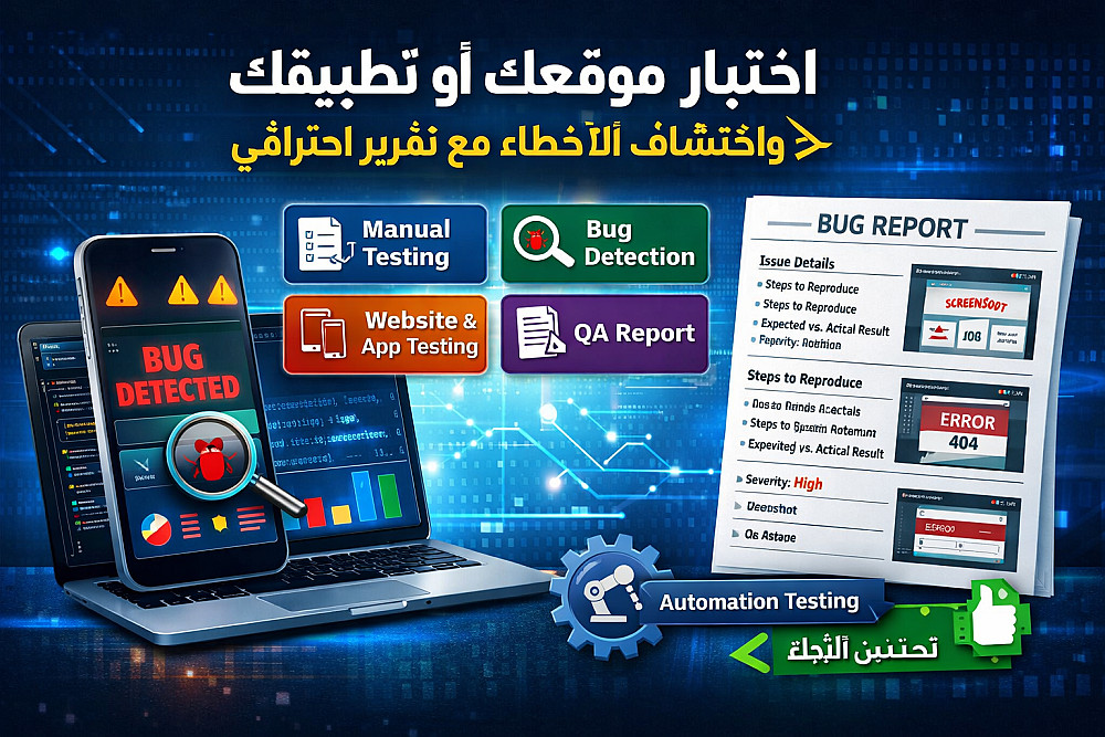 أقدم لك خدمة Manual Software Testing لاكتشاف الأخطاء والمشكلات التي قد تؤثر على أداء مشروعك وتجربة المستخدم. سأقوم باختبار موقعك أو تطبيقك بدقة وكأنني مستخدم حقيقي لضمان أفضل جودة قبل النشر.